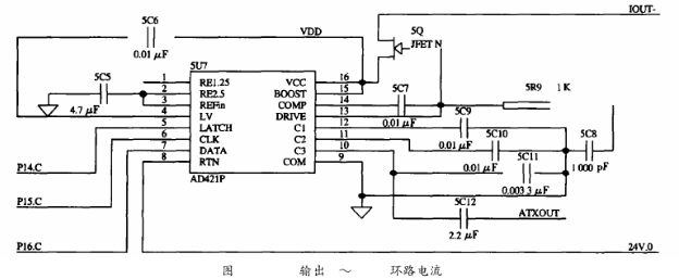 HT2012需要外部提供460.8kHz的時鐘信號,且要求時鐘頻率的誤差是0.1%,若直接入一個460.8kHz的晶振不僅會引起系統(tǒng)功耗的增加,而且該晶振屬于非標準晶振,需專門定制。為了解決這一問題,在系統(tǒng)中采用一片1.8432MHz的晶振以產生時鐘信號,再經分頻器CD4013進行4分頗,可輸出1.8432MHz/4=460.8kHz的分頻信號供HT2012使用。AD421其內部的電壓調節(jié)器與外部的場效應管DN25D對輸入到AD421的電壓進行調整,可提供+3.3V電壓作為其他設備的電源。HART發(fā)出的FSK信號,經過一個電容耦合送到AD421中,轉換成相應的0.5mA正弦電流信號,實現(xiàn)電壓信號到電流信號的轉換,同時,疊加在4~20mA的電流上送給接收設備,實現(xiàn)了HART協(xié)議的信息的交換。本電路耦合電容取為0.0033μF,如圖5所示。