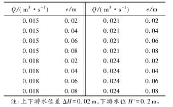 有限水域的浮體結(jié)構(gòu)在不同來流動水中運行時,浮體結(jié)構(gòu)位置的改變會對流場產(chǎn)生影響,從而影響浮體結(jié)構(gòu)的泄流能力以及穩(wěn)定性。試驗過程中固定浮體結(jié)構(gòu)的體型不變(長L=0.20m,寬B=0.30m,高a=0.10m),分別選取4種不同來流流量Q及浮體結(jié)構(gòu)位置e,控制浮體結(jié)構(gòu)在上、下游水位不變的條件下進行試驗,具體試驗參數(shù)設(shè)計及說明見表1以及圖2。