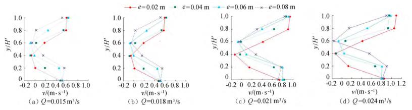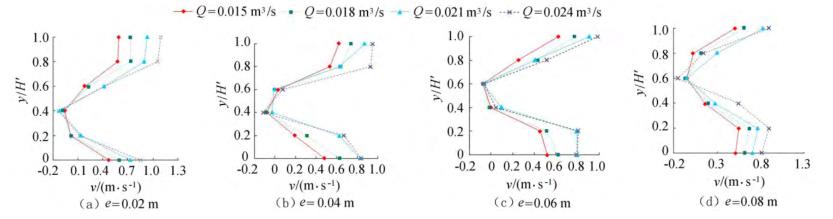 圖4橫坐標(biāo)為斷面水流方向流速,縱坐標(biāo)為測點垂向位置與下游水位的比值y/H'。隨著浮體結(jié)構(gòu)位置的上升,*小斷面流速位置同樣上升。以圖3(a)為例,當(dāng)e=0.02m時,下游斷面位置自下而上呈現(xiàn)先減小、后增大的趨勢,在y/H'=0.40時流速達到*小,隨著浮體結(jié)構(gòu)位置的上升,*小流速呈現(xiàn)向上偏移的趨勢。在斷面位置y/H'=0.20時,隨著e的增大,流速呈現(xiàn)增大的趨勢。當(dāng)e較小時,流經(jīng)浮體結(jié)構(gòu)下部進行下泄的水流較少,主流出現(xiàn)在浮體結(jié)構(gòu)的上部,且在浮體結(jié)構(gòu)的阻擋作用下出現(xiàn)回流區(qū);隨著e上升,主流偏向浮體結(jié)構(gòu)下部區(qū)域,流速增大。與y/H'=0.20的流速分布正好相反,當(dāng)y/H'=0.80時,流速分布隨著浮體位置的增大而減小。隨著e的增大,通過浮體結(jié)構(gòu)下部泄流的水體增多,主流開始向下偏移。試驗過程中,浮體結(jié)構(gòu)處于淹沒狀態(tài),流速的分布隨著浮體位置的改變呈現(xiàn)上大、中小、下大的分布趨勢,在浮體結(jié)構(gòu)下游區(qū)域形成回流區(qū),回流區(qū)的位置隨著浮體結(jié)構(gòu)的上升而上升。