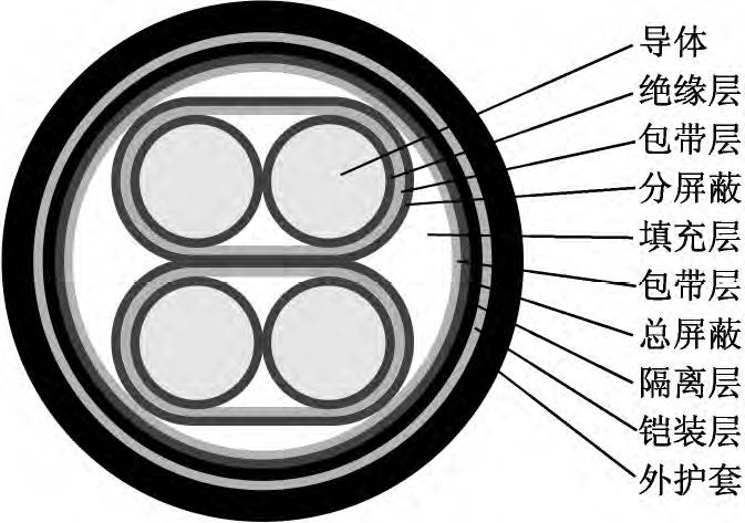 該新型電纜的結(jié)構(gòu)如圖1所示。導(dǎo)體為單股退火鍍錫軟銅線,以提高導(dǎo)體的導(dǎo)電性和防腐蝕性。在導(dǎo)體外繞包一層?。疲矗ň鬯姆蚁┌雽?dǎo)電帶,有利于降低導(dǎo)體和絕緣之間的摩擦起電噪音。絕緣采用材料較為純凈、介電常數(shù)較小、具有一定彈性的聚丙烯絕緣級材料,并采用擠壓式擠出,減小絕緣層與導(dǎo)體的間隙。采用對絞組作為信號傳輸線,由于在兩根傳輸線上感應(yīng)的電壓接近相等,減小了電壓差值,提高了信號傳輸穩(wěn)定性;對絞組由兩種不同顏色絕緣線芯組成,相鄰線對對絞節(jié)距應(yīng)不大于100mm。對絞分屏蔽組(即對對絞組進(jìn)行分屏蔽,每對對絞組外繞包兩層聚酯帶和一層厚0.04mm鋁塑復(fù)合帶繞包,內(nèi)置一根7×0.26mm鍍錫銅絞線作引流線)有利于對不同對絞組之間信號串音的抑制和隔離。對絞分屏蔽組同心式絞合成纜,在對絞分屏蔽組間填充非吸濕性材料,以保證纜芯圓整。在成纜纜芯外繞包兩層聚酯帶,再采用鋁塑復(fù)合帶繞包,內(nèi)置鍍錫銅線作引流線,以提高電纜電磁屏蔽能力??偲帘螌油鈹D包隔離層(隔離護(hù)套),隔離層采用絕緣級低密度聚乙烯材料。隔離層外采用鎧裝層,鎧裝材料為高導(dǎo)磁合金鋼帶,其為強(qiáng)磁材料,可將外來的磁通大部分限制在鎧裝層的外表面上(僅有少部分能進(jìn)入被屏蔽的空間);鎧裝時(shí)對高導(dǎo)磁合金鋼帶采用縱包焊接,確保其形成一連續(xù)圓柱管;鎧裝層可提高電纜抗電磁干擾水平以及對電纜進(jìn)行加強(qiáng),減少電纜振動(dòng)引起的電動(dòng)勢。外護(hù)套采用藍(lán)色軟PVC(聚氯乙烯)護(hù)層級電纜材料擠包,實(shí)現(xiàn)電纜防護(hù)。