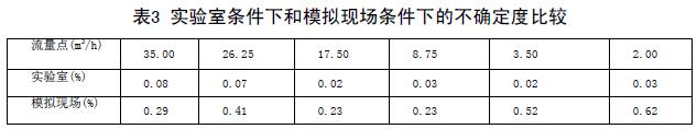實驗室條件下和模擬現(xiàn)場條件下的不確定度比較(表3)兩次結(jié)果可以看出,兩次實驗各個流量點的不確定度差距非常大??梢?,化工污水流量計對安裝條件還是比較苛刻的。