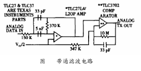HART數(shù)字信號規(guī)范是峰值為1mA、平均值為0mA正弦交流電流信號,此信號經(jīng)線路阻抗轉(zhuǎn)化為正弦交流電壓信號,而HT2012輸入和輸出信號是0~5V的方波信號,因此在HT2012和外部的HART信號之間還需要有濾波電路和整形電路。如圖3所示,由TLC27組成的濾波器是帶通濾波器,用來減少接收信號的噪聲干擾。濾波器還用來消除波形中的尖峰,從而使接收到的信號變得平緩。TLC37組成的數(shù)字方波產(chǎn)生回路把經(jīng)過TLC27濾波后的正弦波轉(zhuǎn)變成相應(yīng)的方波,以便于HT2012接收。