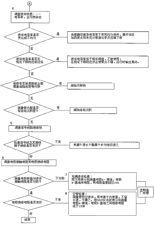 檢查流程圖*5項(xiàng)。信號回路絕緣下降會(huì)形成零點(diǎn)不穩(wěn)。信號回路絕緣下降的土要原因足,包極部位絕緣下降所引起的,但也不能排除信號電纜及其接線端子絕緣下降或破壞。因?yàn)橛袝r(shí)候現(xiàn)場環(huán)境十分嚴(yán)酷,稍一疏忽儀表蓋、導(dǎo)線連接處密封不慎,彌漫著潮氣酸霧或粉粒塵埃侵入儀表接線盒或電纜保護(hù)層,使絕緣卜降。信號回路絕緣電阻檢查分別按電纜側(cè)和流量傳感器側(cè)兩郵分進(jìn)行,用兆歐表測試。因信號電纜容易可先做。流量傳感器再分兩次進(jìn)行:充滿液體測黽電極表面接觸電阻和個(gè)管后測量,U極絕緣電阻。