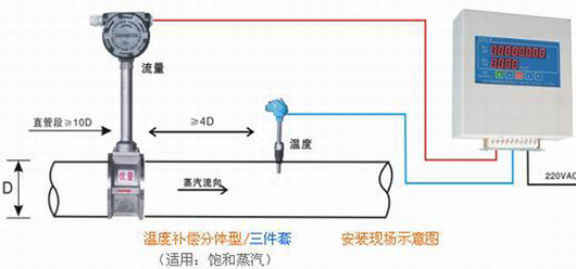 2、溫度補(bǔ)償一體型渦街流量計(jì)還帶有溫度傳感器,可以直接測(cè)量出飽和蒸汽的溫度并計(jì)算出壓力,從而顯示飽和蒸汽的質(zhì)量流量。
