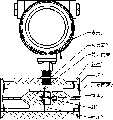 流體流經(jīng)傳感器殼體,由于葉輪的葉片與流向有一定的角度,流體的沖力使葉片具有轉(zhuǎn)動(dòng)力矩,克服摩擦力矩和流體阻力之后葉片旋轉(zhuǎn),在力矩平衡后轉(zhuǎn)速穩(wěn)定,在一定的條件下,轉(zhuǎn)速與流速成正比,由于葉片有導(dǎo)磁性,它處于信號(hào)檢測(cè)器(由永久磁鋼和線圈組成)的磁場(chǎng)中,旋轉(zhuǎn)的葉片切割磁力線,周期性的改變著線圈的磁通量,從而使線圈兩端感應(yīng)出電脈沖信號(hào),此信號(hào)經(jīng)過(guò)放大器的放大整形,形成有一定幅度的連續(xù)的矩形脈沖波,可遠(yuǎn)傳至顯示儀表,顯示出流體的瞬時(shí)流量或總量。在一定的流量范圍內(nèi),脈沖頻率f與流經(jīng)傳感器的流體的瞬時(shí)流量Q成正比,流量方程為: