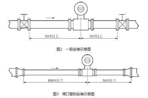 堿液計量表的安裝質量對其測量結果的影響較大,因此在安裝時需要注意幾個問題。*先,堿液計量表直管段的選擇在配管時一定要按照要求進行選擇,一般選擇流量計通徑與工藝管道通徑相同,即可滿足工程需要,而且安裝方便、壓力損失小,流量計直管段上游側的長度不少于5倍工藝管道直徑,下游側的長度不少于3倍工藝管道直徑(圖2)。但在流速太慢而又要求精度較高或需要變徑的應用場合,可選擇通徑小于工藝管道通徑的流量計,以提高測量精度,此時流量計上、下游必須加裝異徑管,且進口異徑管上游側應有長于10倍工藝管道直徑的直管段,下游側應有長于5倍工藝管道直徑的直管段(圖3)。