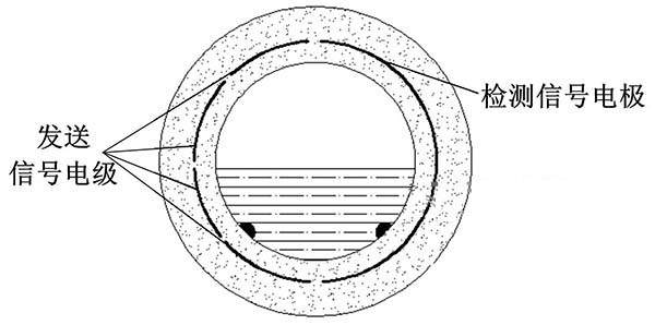 ③利用阻抗或信號衰減研制的非滿管一寸管污水流量計。這種結(jié)構(gòu)的非滿管一寸管污水流量計是當前國內(nèi)研究的方向之一。其結(jié)構(gòu)是流量管底部貼一對信號發(fā)射電極,在流量管中間貼信號接收電極。由于信號在流體中傳播會產(chǎn)生衰減,且傳播時間越長,衰減越多,因此通過信號接收電極接收到的信號衰減量即可得知液面高度;同時該電極還能測量流體切割磁感線產(chǎn)生的電動勢,以此達到測量非滿管流量的目的。阻抗式或信號衰減非滿管一寸管污水流量計結(jié)構(gòu)簡圖如圖5所示。
