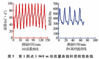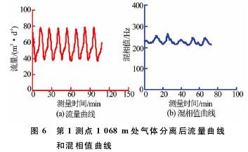 T-××-××1井是大慶油田采油五廠1口水驅(qū)產(chǎn)出井,采用阻抗式含水率計(jì)在該井進(jìn)行了測(cè)試。圖3、圖4分別為測(cè)點(diǎn)深度1097.3m測(cè)量的流量及混相值曲線圖。2min的采樣時(shí)間內(nèi),流量及混相值曲線波動(dòng)劇烈,明顯受井下產(chǎn)氣影響,進(jìn)行平均值計(jì)算時(shí)只能取后半段較平穩(wěn)的數(shù)據(jù),因此,測(cè)試時(shí)需延長測(cè)量時(shí)間。錄取不同范圍數(shù)值時(shí)流量及含水率測(cè)量差值較大,流量平穩(wěn)段為14.81m3/d,高值時(shí)達(dá)到23.52m3/d;取不同測(cè)量段的混相值時(shí)測(cè)量含水率*大相差12%。重復(fù)測(cè)量得到了相同的測(cè)量結(jié)果。由此可見,氣體對(duì)流量及含水率測(cè)量產(chǎn)生了非常大的測(cè)量誤差。