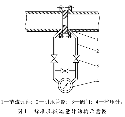 標(biāo)準(zhǔn)二氧化碳流量計結(jié)構(gòu)如圖1所示,包括節(jié)流元件(標(biāo)準(zhǔn)孔板及其取壓裝置)、傳輸壓差信號的引壓管路、閥門以及差壓計等部分。標(biāo)準(zhǔn)孔板是壓差測量時的一次元件,人們利用它在管道內(nèi)使流體產(chǎn)生壓差,再通過引壓管路把孔板前、后產(chǎn)生的壓差傳送給差壓變送器,再輸人到二次儀表,從而顯示出管道內(nèi)流體的靜壓、壓差、瞬時流量和累計流量等計量參數(shù)。