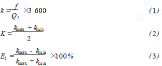 將乙烯流量計(jì)在標(biāo)準(zhǔn)水裝置上,分別用頻譜分析和脈沖計(jì)數(shù)的方法進(jìn)行標(biāo)定,流體介質(zhì)為水未加氣體,采用的標(biāo)準(zhǔn)傳感器為精度等級(jí)為0.2級(jí)的電磁流量計(jì)。在每個(gè)流量測(cè)量點(diǎn)上的儀表系數(shù)用公式(1)計(jì)算,然后用式(2)計(jì)算得到*終儀表系數(shù)K。Ql為被測(cè)水的流量值,f為每一個(gè)流量點(diǎn)得到的頻率,k為每個(gè)測(cè)量點(diǎn)得到的儀表系數(shù)。kmax、kmin分別為試驗(yàn)流量范圍內(nèi)得到的*大與*小的儀表系數(shù)。儀表系數(shù)的線性度E1用式(3)來計(jì)算。