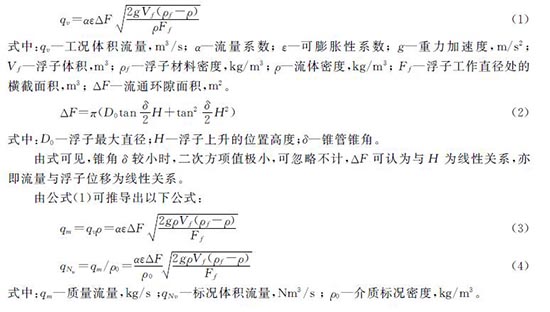 流量計垂直安裝在管道上,流體自下向上流經(jīng)錐管,浮子在P1、P2差壓作用下產(chǎn)生上升或下移,當浮子此差壓(P2-P1)與浮子重力G、浮力F、粘滯力合力平衡時,處于平衡狀態(tài)。建立方程并推導(可參考相關(guān)專業(yè)資料,此處省略),忽略粘滯力影響,假設流量系數(shù)為常數(shù),可得出浮子位移與流量成線性對應關(guān)系。浮子流量計的流量方程為: