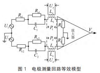 提出在硬件電路上加入模擬開(kāi)關(guān), 干擾尖峰到來(lái)時(shí)斷開(kāi)模擬開(kāi)關(guān)避免干擾進(jìn)入后級(jí)電路,尖峰過(guò)去重新打開(kāi)模擬開(kāi)關(guān);K.Saito 等提出漂移校正法,先以高勵(lì)磁頻率進(jìn)行勵(lì)磁,在勵(lì)磁過(guò)程中插入低勵(lì)磁頻率提取用于漂移校正的非固定微分噪聲分量,但在插入的低勵(lì)磁頻率段漿液噪聲較大且很難將漿液噪聲與流量信號(hào)分離,此時(shí)的校正因子非單純的非固定噪聲分量,改進(jìn)措施是長(zhǎng)時(shí)間取平均值得到穩(wěn)定因子。 傳統(tǒng)方法是同步采樣保持法,即在磁場(chǎng)穩(wěn)定階段采樣。 其他消除干擾的方法有設(shè)置干擾補(bǔ)償機(jī)構(gòu)、控制勵(lì)磁電流變化率減小干擾幅值、矩形波代替梯形波、希爾伯特黃變換結(jié)合傅里葉變換和程控增益技術(shù)等。經(jīng)上述對(duì)現(xiàn)有的文獻(xiàn)分析與總結(jié)可知, 當(dāng)前消除微分噪聲主要從信號(hào)處理方面入手,并未對(duì)影響噪聲的因素加以研究。 本文建立電極測(cè)量回路等效模型,給出仿真模型搭建、參數(shù)取值和仿真結(jié)果分析。