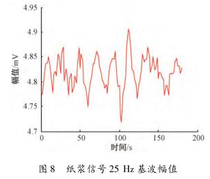 在頻域中對(duì)紙漿信號(hào)觀察時(shí)發(fā)現(xiàn),紙漿信號(hào)的漿液噪聲頻帶在零頻率點(diǎn)附近,距離流量信號(hào)基波頻率點(diǎn)較遠(yuǎn),對(duì)基波幅值和各奇次諧波幅值基本沒有影響,紙漿信號(hào)在頻域中的圖形如圖7所示。選擇一組采集的紙漿信號(hào),把其等分成數(shù)段,利用MATLAB計(jì)算每段數(shù)據(jù)在基波處的幅值并提取保存在一個(gè)數(shù)組中,使用繪圖工具畫出來,如圖8所示。可見,基波幅值在4.7~4.95mV變化,波動(dòng)較小。因此,提取到的與流量相關(guān)的感應(yīng)電動(dòng)勢(shì)信號(hào)幅值會(huì)比較穩(wěn)定。