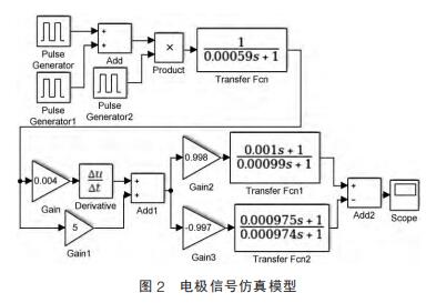 本文基于 Matlab 中 Siumlink 對電極信號進行仿真,勵磁方式為三值波勵磁,勵磁頻率 f=25Hz,傳感器參數 D=40mm、Rx=88.8Ω、Lx=162mH,勵磁系統參數 Ue=100V、穩(wěn)態(tài)電流 I0=200mA?;陔姌O測量回路搭建的仿真模型如圖 2 所示,圖中信號模塊 pulsGenerator 通過加法器、乘法器得到勵磁電流。由公式(1),在固定流速下感應電勢與勵磁電流成正比,通過增加 Gain1 模塊得到感應電勢信號。 對勵磁電流進行求導即經模塊 Derivative 得到微分噪聲, 其中 Gain 值與 Lx 和 L1 相關。 感應電勢與噪聲經Add1 疊加之后得到電極信號 E1(t)。 scope 觀察輸出信號波形。仿真波形和真實波形如圖 3 所示。 將傳感器參數代入到勵磁電流穩(wěn)態(tài)調節(jié)時間公式中,得電流上升時間為 360μs,測得實際上升時間為 390μs,兩者相差不大,驗證了仿真模型的正確性。