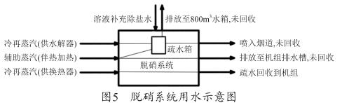從圖5可以看出,脫硝系統(tǒng)所使用的冷再蒸汽和輔助蒸汽換熱后全部冷凝為疏水,供水解器的蒸汽和部分伴熱加熱的蒸汽回收至脫硝系統(tǒng)的疏水箱,部分伴熱蒸汽疏水直接排放至機組排水槽,未進(jìn)行回收。疏水箱的水一部分被脫硝系統(tǒng)利用,另一部分排放至機組800m 3 水箱,未進(jìn)行回收。下面結(jié)合耗水量對蒸汽耗量進(jìn)行判斷 :