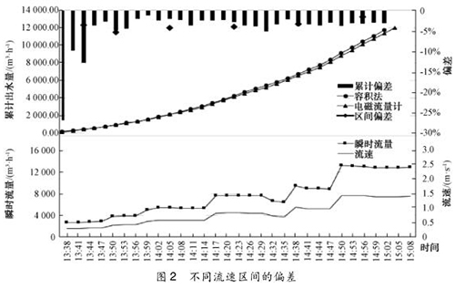 圖 2 的結(jié)果顯示,容積法校驗(yàn)電磁流量計(jì)累計(jì)偏差開始階段不穩(wěn)定,后期趨于穩(wěn)定,在 -3. 0%附近。這是測(cè)量中不可避免存在某幾個(gè)時(shí)刻(特別出廠水流量改變時(shí))某些測(cè)量點(diǎn)液位波動(dòng)較大,導(dǎo)致記錄數(shù)值與真實(shí)情況存有較大差異,一開始累計(jì)出水總量較少,偏差會(huì)相對(duì)放大,在后期累計(jì)水量大,這一原因?qū)е碌钠顪p少,偏差值也趨于穩(wěn)定。