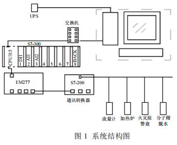 集氣站是收集氣井所生產(chǎn)天然氣的站場,在集氣站內(nèi)對天然氣進行節(jié)流降壓、加熱、調(diào)壓計量等各種工藝預(yù)處理,設(shè)備眾多且分散。為方便進行檢測和操作,必須進行統(tǒng)一的數(shù)據(jù)采集,在監(jiān)控臺進行數(shù)據(jù)的管理。集氣站設(shè)備主要包括加熱爐、高壓型電磁流量計、分子篩、火災(zāi)報警盤,以及供電設(shè)備 UPS 等,這些不同廠家的設(shè)備基本都支持Modbus 協(xié)議,通過 Modbus 通訊可以將這些數(shù)據(jù)采集。為了有效降低成本,設(shè)計了如圖 1 所示的系統(tǒng)。系統(tǒng)采用西門子 S7-300 控制器,通過以太網(wǎng)連接上位機監(jiān)控軟件,再通過 MP277 連接S7-200 的方式。S7-200 控制器自帶 RS485 接口,能夠進行 Modbus 通訊,采集現(xiàn)場各種設(shè)備數(shù)據(jù)。*后通過以太網(wǎng)通訊將設(shè)備數(shù)據(jù)上傳至監(jiān)控軟件,方便操作人員進行監(jiān)控,該方案簡單有效,能夠?qū)崿F(xiàn)集氣站內(nèi)設(shè)備的狀態(tài)監(jiān)控,數(shù)據(jù)處理,有效的進行天然氣的生產(chǎn)工作。