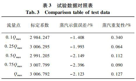 測試對象為同一臺表,DN80 口徑,帶有在空氣標定裝置上的 5 點標定系數(shù)。將管道介質(zhì)設(shè)定為過熱蒸汽,并預設(shè)溫度為 160 ℃ 和壓力 0. 4 MPa,以便儀表計算過熱蒸汽的密度。試驗數(shù)據(jù)對照如表 3 所示。