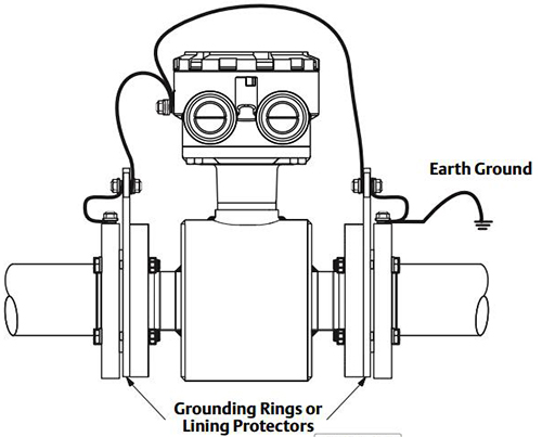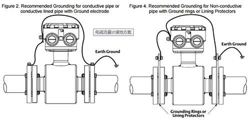 如前圖所示,當(dāng)靠近氫硫酸流量計(jì)的管道不能提供良好的流體電連接時(shí),需要接地環(huán)或接地電極。也就是說(shuō),管道內(nèi)襯或由非導(dǎo)電材料制成。