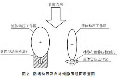 新二氧化氯流量計采用拋物面導向型結構作為動壓測點,采用對稱自補償型式的靜壓測點,可以有效地解決來流方向偏流時信號的穩(wěn)定采集,來流偏離管道軸線時,可以維持輸出差壓基本不變,如圖2所示。