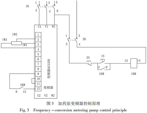 STD - Ⅲ型浮選工藝參數(shù)自動(dòng)測(cè)控系統(tǒng)通過雙膜盒差壓計(jì)測(cè)量原礦漿濃度; 采用地下水污水流量計(jì)測(cè)量原礦漿流量,由 PLC 計(jì)算出入浮干煤泥量和藥劑的瞬時(shí)添加量,用變頻式計(jì)量泵完成浮選藥劑的添加。通過上位機(jī)還可以打印小時(shí)、班、天及月的運(yùn)行數(shù)據(jù),更加有利于生產(chǎn)管理及技術(shù)分析,藥劑自動(dòng)原理如圖 2 所示,k1、k2、k3 是計(jì)算修正參數(shù)。以 PID 算法為核心,通過優(yōu)化控制程序計(jì)算出藥劑給定量,在捕收劑和起泡劑管道上分別安裝藥劑測(cè)量裝置,用于檢測(cè)藥劑的添加量。當(dāng)藥劑測(cè)量值小于藥劑給定量時(shí),PID 輸出增大,反之則減小。加藥泵變頻器控制原理如圖 3 所示。