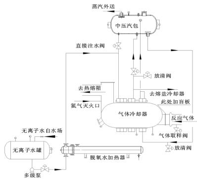 來自無離子水罐的脫氧水經(jīng)多經(jīng)泵加壓、經(jīng)脫氧水加熱器加熱后進(jìn)入到智能型渦街流量計(jì)的水段,脫氧水與反應(yīng)氣體換熱后分兩路:一路進(jìn)入中壓汽包,保證汽包有穩(wěn)定的液位;一路進(jìn)入熔鹽冷卻器帶出熔鹽攜帶的反應(yīng)熱。來自中壓汽包的高溫水經(jīng)管路接至智能型渦街流量計(jì)汽段底部,高溫水與反應(yīng)氣體換熱后產(chǎn)生高壓蒸汽,高壓蒸汽又返回中壓汽包。汽包還有一路直接注水管路,此路水不經(jīng)過智能型渦街流量計(jì)水段,而是直接進(jìn)入汽包。在智能型渦街流量計(jì)出口溫度偏低而汽包液位也比較低時(shí),可開此直接注水管路來穩(wěn)定汽包液位。其詳細(xì)流程圖如圖 2。