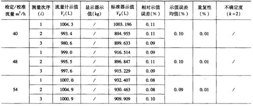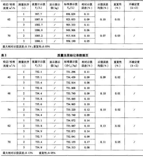 表1是用容積法現(xiàn)場檢測流量計后,電腦自動生成的原始記錄數據頁部分,表2是用質量法現(xiàn)場檢測流量計后,電腦自動生成的原始記錄數據頁部分。