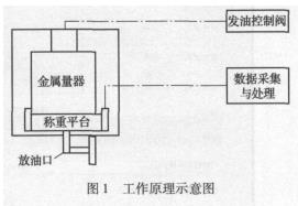 本裝置采用容積法和稱重法相結合的工作原理。對于質量流量計,采用稱量法直接比較,確定流量計的誤差。上裝放油閥防溢出控制系統(tǒng),采用液位動態(tài)監(jiān)視,一旦超過容器安全液位高度,即可切斷發(fā)油動力。在運輸防震或非測量狀態(tài)時,對秤進行與稱重容器的脫離操作,保證稱重的可靠性。在稱重狀態(tài)時,需要對枰進行調平和清零,此部分采用動態(tài)水平的方式進行,即以水平位一致的方法調整稱重平臺。工作原理如圖1所示。