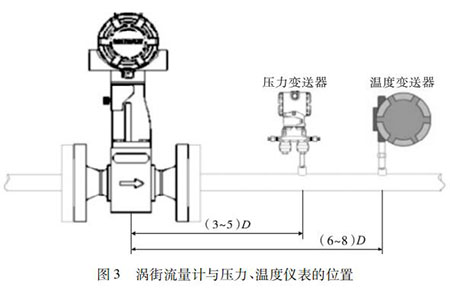 脫硝煙氣流量計的口徑如果與工藝管道相同,不能滿足流量儀表要求時,或者在此流速下測量準(zhǔn)確度不能保證時,需要縮小儀表口徑,從而提高管內(nèi)流速,保證測量精度。上下游必須有足夠的直管段,若傳感器安裝點的上游在同一平面上有 2 個 90°彎頭時,上游直管段≥25D,下游直管段≥5D。根據(jù)測量的需要,需在流量計附近測量壓力和溫度時,測壓點應(yīng)在傳感器下游的( 3 ~ 5) D 處,測溫點應(yīng)在傳感器下游的( 6 ~ 8) D 處,如圖 3 所示。