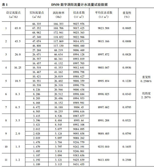 將本文實(shí)現(xiàn)的數(shù)字鍋爐煙氣流量計(jì)在上述 50mm 口 徑( 簡(jiǎn)稱 DN50) 的水流量試驗(yàn)裝置上進(jìn)行試驗(yàn)。先在其正常流量范圍內(nèi)進(jìn)行試驗(yàn),流量從大到小逐漸降低,之后不斷探求其所能測(cè)量的*小流量。每個(gè)流量點(diǎn)試驗(yàn)三次,計(jì)算其重復(fù)性、平均儀表系數(shù)和線性度。水流量試驗(yàn)數(shù)據(jù)如表 1 所示。