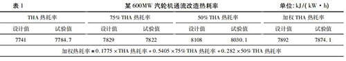 隨著火電機(jī)組利用小時(shí)數(shù)降低,發(fā)電企業(yè)一般都會(huì)根據(jù)不同負(fù)荷工況下的實(shí)際運(yùn)行小時(shí)數(shù),確定機(jī)組熱耗率考核權(quán)重,形成*終的加權(quán)熱耗率考核值。考核加權(quán)熱耗率對(duì)設(shè)備廠家末級(jí)葉片選型、高壓調(diào)門與高壓缸匹配性提出了更高的要求,在當(dāng)前負(fù)荷率偏低的情況下增強(qiáng)了發(fā)電企業(yè)的競爭力。然而,僅僅對(duì)加權(quán)熱耗率進(jìn)行考核是不夠的,設(shè)備廠家為了增強(qiáng)自身的競爭力,往往會(huì)把全部重點(diǎn)放在如何降低占比大的低負(fù)荷熱耗率上而犧牲高負(fù)荷的熱耗率,這無疑削弱了發(fā)電企業(yè)的適應(yīng)性。某廠一臺(tái) 600MW 汽輪機(jī)通流改造時(shí)僅對(duì)加權(quán)熱耗率進(jìn)行考核,THA 熱耗率要高出設(shè)計(jì)值43. 7 kJ/( kW·h) ,詳見表 1。通流改造時(shí)既要對(duì)加權(quán)熱耗率進(jìn)行考核,也要對(duì) THA工況時(shí)熱耗率進(jìn)行考核。