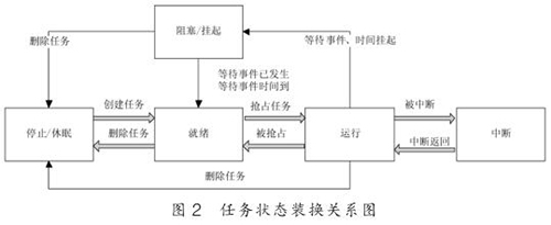 μC/OS-III 中的每一個任務都是無限循環(huán)的 。 每個任務會有五種狀態(tài),并且處于五種狀態(tài)之一。 這五種狀態(tài)分別是:睡眠態(tài)、就緒態(tài)、運行態(tài)、等待態(tài)以及中斷服務態(tài)。 睡眠態(tài)是指任務只是以代碼的形式存在于程序空間, 并未交給操作系統(tǒng)進行管理; 就緒態(tài)是指系統(tǒng)為任務配備了任務控制塊且在任務就緒表中進行了就緒登記,使任務具備了運行的充分條件;運行態(tài)是指處于就緒態(tài)的任務如果經(jīng)調(diào)度器判斷獲得了 CPU 的使用權時的狀態(tài);等待態(tài)則是正在運行的任務,需要等待一段時間或需要等待一個事件發(fā)生再運行; 中斷服務狀態(tài)是指一個正在運行的任務一旦響應中斷申請就會中止運行而去執(zhí)行中斷服務程序。這五種狀態(tài)在系統(tǒng)管理下的轉換關系由圖 2 所示。