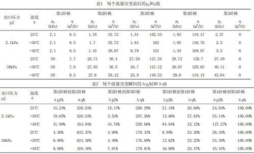 為了深入研究溫度及流量突變對(duì)衛(wèi)生級(jí)電磁流量計(jì)響應(yīng)速度的影響趨勢(shì),把每個(gè)流量突變點(diǎn)前后的出口壓力p2,流量q列表如表1所示。