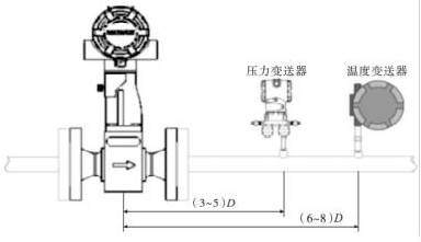 渦街氣體流量計(jì)的口徑如果與工藝管道相同,不能滿足流量?jī)x表要求時(shí),或者在此流速下測(cè)量準(zhǔn)確度不能保證時(shí),需要縮小儀表口徑,從而提高管內(nèi)流速,保證測(cè)量精度。上下游必須有足夠的直管段,若傳感器安裝點(diǎn)的上游在同一平面上有 2 個(gè) 90°彎頭時(shí),上游直管段≥25D,下游直管段≥5D。根據(jù)測(cè)量的需要,需在渦街氣體流量計(jì)附近測(cè)量壓力和溫度時(shí),測(cè)壓點(diǎn)應(yīng)在傳感器下游的(3 ~5)D 處,測(cè)溫點(diǎn)應(yīng)在傳感器下游的(6 ~8)D 處,如圖 3 所示。
