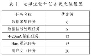 下面以電磁流量計為例說明基于 μC/OS-III 的人機界面設計。 先將 μC/OS-III 移植到 Cortex-M3 處理器上,這里選用的是 STM32F103VET6 。電磁流量計的應用程序若按照上節(jié)的任務種類劃分有: 數(shù)據(jù)采集任務、數(shù)據(jù)處理任務, 4~20mA輸出任務, Hart 通訊任務以及用戶交互任務。 先對不同的任務進行優(yōu)先級的劃分,如表 1 所示。