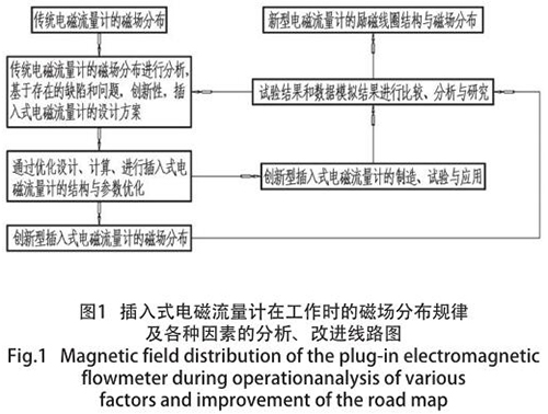 測水流量計(jì)因其特殊的結(jié)構(gòu)形式,致使其抗干擾能力較弱、準(zhǔn)確度偏低以及瞬時流量波動過大等不良現(xiàn)象,但便于安裝、造價(jià)低廉、普遍應(yīng)用于大管道等特點(diǎn)而存在。為了發(fā)揮其優(yōu)勢,消除其不利因素,對其內(nèi)部結(jié)構(gòu)及其相關(guān)技術(shù)參數(shù)進(jìn)行優(yōu)化設(shè)計(jì),從而使其準(zhǔn)確度能夠達(dá)到 ±1% FS,使抗干擾能力得到極大地增強(qiáng)。本文主要通過優(yōu)化設(shè)計(jì)、選擇材料和試驗(yàn),使測水流量計(jì)的穩(wěn)定性和準(zhǔn)確度大幅度提高,并提出解決措施,對實(shí)際應(yīng)用具有參考價(jià)值。分析與研究程序圖如圖 1 所示。
