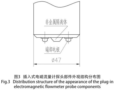 通過大量的試驗(yàn),對探頭端部外型結(jié)構(gòu)亦采用特殊設(shè)計(jì),從而消除兩個電極之間的擾流現(xiàn)象,同時亦消除因通電產(chǎn)生磁場,導(dǎo)致兩個電極吸附介質(zhì)中的鐵屑而影響測量精度和死區(qū)效應(yīng),增強(qiáng)了輸出信號的穩(wěn)定性,從而提高傳感器準(zhǔn)確度和抗干擾性。通過結(jié)構(gòu)的優(yōu)化設(shè)計(jì),使用壽命更長,測水流量計(jì)探頭局部,如圖 3 所示。