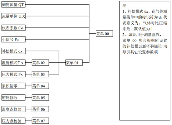 3.1、本儀表表頭采用自導(dǎo)引式和菜單式相結(jié)合的參數(shù)設(shè)置方式,所謂自導(dǎo)引式參數(shù)設(shè)置方式就是用戶在進(jìn)入菜單 00 項后,表頭中的微電腦會自動導(dǎo)引用戶去設(shè)置需要設(shè)置的參數(shù)。另外,用戶也可以通過菜單模式分別對各組參數(shù)進(jìn)行設(shè)置。蒸汽測量菜單框圖如下: