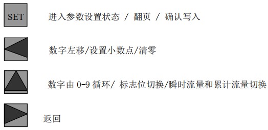 (3)標(biāo)況流量計(jì)算公式(若補(bǔ)償后單位為 U.0):(4)標(biāo)況流量計(jì)算公式(若補(bǔ)償后單位為 U.1):注:標(biāo)況指 20℃,1 標(biāo)準(zhǔn)大氣壓三、一體化液晶顯示表頭參數(shù)設(shè)置操作說(shuō)明(V03Z)1、鍵盤按鍵說(shuō)明2、 顯示窗字符說(shuō)明注:表中 x 代表“0”或“1”;Zn:標(biāo)準(zhǔn)狀態(tài)下(20℃,1 標(biāo)準(zhǔn)大氣壓),被測(cè)氣體的壓縮系數(shù),Z:工作狀態(tài)下被測(cè)氣體的壓縮系數(shù)3、 操作說(shuō)明3.1、本儀表表頭采用自導(dǎo)引式和菜單式相結(jié)合的參數(shù)設(shè)置方式,所謂自導(dǎo)引式參數(shù)設(shè)置方式就是用戶在進(jìn)入菜單 00 項(xiàng)后,表頭中的微電腦會(huì)自動(dòng)導(dǎo)引用戶去設(shè)置需要設(shè)置的參數(shù)。另外,用戶也可以通過(guò)菜單模式分別對(duì)各組參數(shù)進(jìn)行設(shè)置。蒸汽測(cè)量菜單框圖如下:3.2、參數(shù)設(shè)置約定:在設(shè)置各項(xiàng)參數(shù)時(shí),提示符閃動(dòng)代表該項(xiàng)參數(shù)沒(méi)有設(shè)置完或者尚未確認(rèn),可以通過(guò)按SET 鍵來(lái)確認(rèn)或者按→鍵退出;提示符不閃動(dòng)代表該項(xiàng)參數(shù)已設(shè)置完并確認(rèn),此時(shí)可以通過(guò)按 SET 鍵翻頁(yè)或者按→鍵退出。進(jìn)入?yún)?shù)設(shè)置時(shí),需要輸入密碼(6 位)并確認(rèn)進(jìn)入,為了防止誤進(jìn)入?yún)?shù)設(shè)置菜單,保證儀表正常工作,在設(shè)置密碼時(shí),使用↑鍵調(diào)數(shù)時(shí)不能循環(huán)調(diào)數(shù),只能單次調(diào)數(shù),只有密碼輸入正確進(jìn)入各項(xiàng)參數(shù)設(shè)置菜單后才可以對(duì)各位循環(huán)連續(xù)調(diào)整數(shù)據(jù)。3.3、儀表參數(shù)設(shè)置舉例:儀表出廠前各項(xiàng)參數(shù)已設(shè)置好,用戶無(wú)需設(shè)置。如果用戶需要設(shè)置某項(xiàng)參數(shù),請(qǐng)參照以下步驟,例如修改刻度流量值 QT:在工作狀態(tài)下,按 SET 鍵,顯示屏顯示 P,數(shù)字位為全零,8 秒鐘若無(wú)操作,自動(dòng)返回工作狀態(tài)。輸入密碼 :按數(shù)字↑鍵和左移←鍵,輸入密碼數(shù) xxxxx(出廠時(shí)默認(rèn)密碼為 000123),↑鍵調(diào)各位數(shù)字 0-9,每按 ←鍵一次數(shù)字向右循環(huán)一位,可通過(guò)多次按←鍵對(duì)整段數(shù)字清零,按→鍵可以返回工作狀態(tài)。菜單選擇項(xiàng):按 SET 鍵確認(rèn),顯示屏顯示如右圖所示,末行“00”閃動(dòng)調(diào)整該項(xiàng)值選擇不同參數(shù)設(shè)置菜單。該例直接按 SET 鍵進(jìn)入菜單 00 項(xiàng)設(shè)置刻度流量:QT 閃動(dòng),*一步:*先進(jìn)行小數(shù)點(diǎn)調(diào)整,可以通過(guò)←鍵對(duì)參數(shù)快速清零或者通過(guò)↑鍵進(jìn)行小數(shù)點(diǎn)調(diào)整,調(diào)整完畢,按 SET 鍵確認(rèn)(QT 仍閃動(dòng));*二步:數(shù)值調(diào)整,可以通過(guò)↑鍵對(duì)每位數(shù)字進(jìn)行調(diào)整,按 ←鍵一次數(shù)字向右移動(dòng)一位,調(diào)整完畢,按 SET 鍵確認(rèn),QT 停止閃動(dòng),該項(xiàng)參數(shù)設(shè)置完畢,可進(jìn)行下一項(xiàng)參數(shù)設(shè)置或者退出另外,單位設(shè)置 U.X 和補(bǔ)償方式設(shè)置 dX 通過(guò)↑鍵調(diào)整修改。3.4、校驗(yàn)項(xiàng)說(shuō)明: 儀表出廠前,溫度和壓力通道已校驗(yàn)設(shè)置好,無(wú)需用戶重新校驗(yàn)。校驗(yàn)通道有密碼保護(hù),廠家不對(duì)外開放,如果需要重新校驗(yàn)溫度或者壓力通道,請(qǐng)專業(yè)人員與廠家技術(shù)人員聯(lián)系。4、計(jì)算公式說(shuō)明4.1、蒸汽測(cè)量計(jì)算公式(1)渦街流量?jī)x表工況體積流量計(jì)算公式:(2)密度 d,單位 Kg/m3(3)質(zhì)量流量計(jì)算公式,單位 Kg/h:(4)質(zhì)量流量計(jì)算公式,單位 t/h:4.2、氣體測(cè)量計(jì)算公式----標(biāo)況指 20℃,1 標(biāo)準(zhǔn)大氣壓(1)渦街流量?jī)x表工況體積流量計(jì)算公式:(2)對(duì)比壓縮系數(shù) d(Zn/Z),單位 1(3)標(biāo)況流量計(jì)算公式,單位 Nm3/h:P1—工況絕壓,PN—標(biāo)況絕壓(Mpa),T1—工況熱力學(xué)溫度,TN—標(biāo)況熱力學(xué)溫度(K)