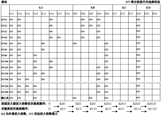 (4)標(biāo)況流量計(jì)算公式,單位 t/h:四、AMPKP09A01 放大板波段開關(guān)調(diào)整參照表五、AMPSW10A01 放大板波段開關(guān)調(diào)整參照表RG=1-F 調(diào)放大器增益,由 1 至 F 依次增大(常用 4-8);RS=1-F 調(diào)觸發(fā)靈敏度,由 1 至 F 依次提高(常用 4-8)不同口徑和介質(zhì)開關(guān)選擇參見附表。并根據(jù)實(shí)際信號(hào)先調(diào)整 K2 和 K3 擴(kuò)展頻帶,必要時(shí)調(diào)整 K1 電荷放大器增益以上表值僅供參考,實(shí)際使用中因液體粘度和氣體密度不同應(yīng)在此值附近調(diào)整,頻率低時(shí)可將 K3 向大口徑方向調(diào)一至三檔。頻率高時(shí)可將 K2 向小口徑方向調(diào)一至三檔。訂貨須知及選型樣譜一.尊敬的用戶,當(dāng)您要選用本公司產(chǎn)品時(shí),請(qǐng)仔細(xì)閱讀選型樣本,并做好以下工作:1.認(rèn)真核對(duì)被測(cè)介質(zhì)的工況條件:溫度、壓力、管徑等工藝參數(shù)。2.認(rèn)真核對(duì)被測(cè)介質(zhì)的使用流量范圍,特別是*小流量值以*終確定使用儀表的口徑及配管參數(shù)。3.確定儀表的安裝地點(diǎn),保證直管段,并為儀表的安裝維護(hù)創(chuàng)造好的環(huán)境條件。4.填好訂貨咨詢單,見附表三二.渦街流量?jī)x表選型表(符合 JB/T9294-1999 標(biāo)準(zhǔn))1.傳感器選型表上一篇:污水流量計(jì)的種類