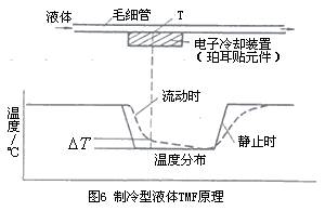 液體用tmf 在20世紀(jì)90年代初中期開始發(fā)展并在工業(yè)生產(chǎn)中應(yīng)用,但當(dāng)前主要為微小流量儀表。有消耗功率測(cè)量法的熱分布式tmf和利用珀?duì)柼? peltier)致冷元件在檢測(cè)部位致冷(即附加熱)的tmf。后者的測(cè)量原理如圖6所示,流量傳感器由測(cè)量毛細(xì)管、電子冷卻裝置(珀?duì)柼?和3各溫度檢出件組成。測(cè)量管和致冷元件接觸,無液體流動(dòng)時(shí)冷卻到某一溫度時(shí),兩者溫度相等;液體流動(dòng)時(shí)致冷元件附近測(cè)量毛細(xì)管溫度上升,如虛線所示分布,測(cè)量溫度檢測(cè)點(diǎn)的兩者溫度差以求的流量。
