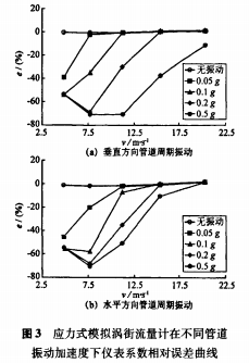 為了對(duì)比不同方向管道振動(dòng)對(duì)渦街流量計(jì)測(cè)量的影響,將管道振動(dòng)改為水平方向重新進(jìn)行試驗(yàn),得到圖3(b)曲線。通過(guò)與圖3(a)比較,發(fā)現(xiàn)兩種情況下流速及振動(dòng)加速度對(duì)儀表系數(shù)相對(duì)誤差的影響趨勢(shì)類(lèi)似。依據(jù)先前擬定的抗振標(biāo)準(zhǔn),應(yīng)力式模擬
