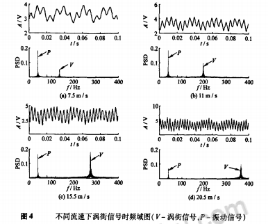 為了觀測(cè)管道周期振動(dòng)下渦街流量信號(hào)的特征,利用NI USB-6009數(shù)據(jù)采集卡對(duì)渦街正弦信號(hào)進(jìn)行采樣。以垂直方向管道振動(dòng)加速度為0.1g為例,給出了不同流速下渦街信號(hào)的時(shí)頻域圖,如圖4所示。由時(shí)域部分可知,管道振動(dòng)下渦街流量傳感器輸出的信號(hào)為真實(shí)旋渦脫落信號(hào)和管道振動(dòng)信號(hào)的合成信號(hào)。低流速(≤1lm/s)時(shí),管道振動(dòng)信號(hào)強(qiáng)、占主要成分,渦街信號(hào)疊加在其上;隨著流速變大(11~20.5m/s),渦街信號(hào)逐漸顯露出來(lái)成為主要成分、淹沒(méi)振動(dòng)信號(hào)。由頻域可知,振動(dòng)信號(hào)成分較單一,呈尖峰狀,幅值為定值,不隨流速變化而變,除40Hz基頻外還有2、3倍頻出現(xiàn);而渦街信號(hào)成分稍復(fù)雜,呈塔峰狀,幅值隨流速變大而迅速增強(qiáng),頻譜能量占總能量比重也隨流速增加而變大。
