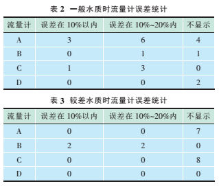 表1中,“—”表示超聲波流量計因接收信號差而不顯示累計流量,誤差>20%的超聲波流量計累計流量表示因接收信號質量差導致的儀器測量錯誤。對表1中的數據進行分類處理,以便得到一般和較差水質2種情況時4臺流量計的誤差統(tǒng)計。表2和表3分別為為一般和較差水質時的流量計誤差統(tǒng)計。