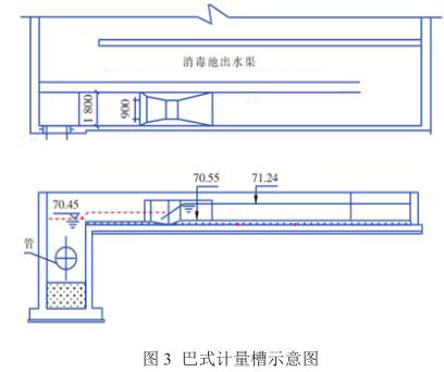 該廠改造后出水經(jīng)二氧化氯消毒后直接排放,為節(jié)省占地,出水明渠與接觸消毒池合建,位于接觸池末端。消毒池出水經(jīng)堰板跌水后通過2.3米的孔洞180°轉(zhuǎn)彎流入出水計(jì)量明渠。如圖3所示。采用巴式計(jì)量槽+超聲波液位計(jì)測(cè)定流量。